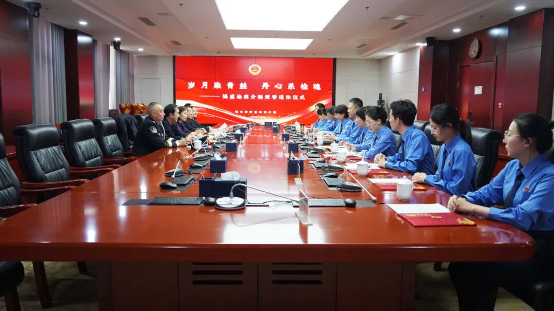 仪式中,还有一个格外暖心的环节 ——新老检察人互赠纪念品。退休同志们带来了珍藏多年的 “检察传家宝”:有检察制服改革前的领花,静静诉说着岁月的变迁;有 1984 年的文件传阅夹,斑驳的封面印刻着往昔办案的严谨身影;有双语法律词典,凝聚着深耕边疆检察工作的执着与坚守;还有熠熠生辉的荣誉勋章、一张张记录着青春岁月的工作证…… 每一件物品的背后,都藏着一段沉甸甸的检察故事,承载着老一辈检察人滚烫的法治情怀。