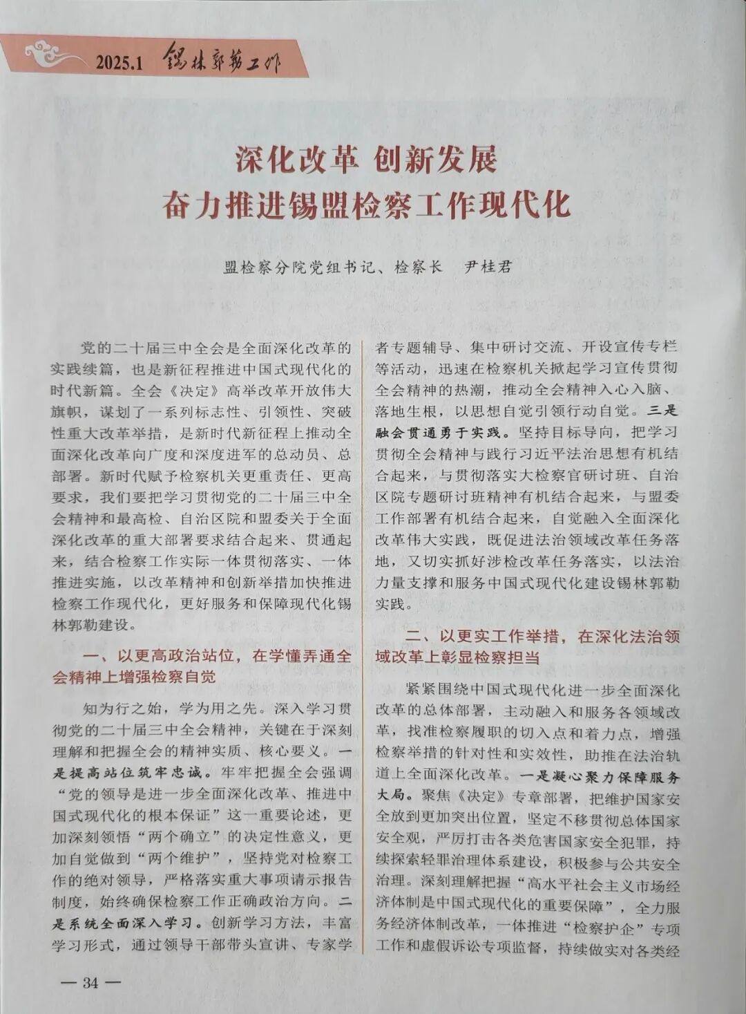 党的二十届三中全会是全面深化改革的实践续篇,也是新征程推进中国式现代化的时代新篇。全会《决定》高举改革开放伟大旗帜,谋划了一系列标志性、引领性、突破性重大改革举措,是新时代新征程上推动全面深化改革向广度和深度进军的总动员、总部署。新时代赋予检察机关更重责任、更高要求,我们要把学习贯彻党的二十届三中全会精神和最高检、自治区院和盟委关于全面深化改革的重大部署要求结合起来、贯通起来,结合检察工作实际一体贯彻落实、一体推进实施,以改革精神和创新举措加快推进检察工作现代化,更好服务和保障现代化锡林郭勒建设。 知为行之始,学为用之先。深入学习贯彻党的二十届三中全会精神,关键在于深刻理解和把握全会的精神实质、核心要义。一是提高站位筑牢忠诚。牢牢把握全会强调“党的领导是进一步全面深化改革、推进中国式现代化的根本保证”这一重要论述,更加深刻领悟“两个确立”的决定性意义,更加自觉做到“两个维护”,坚持党对检察工作的绝对领导,严格落实重大事项请示报告制度,始终确保检察工作正确政治方向。二是系统全面深入学习。创新学习方法,丰富学习形式,通过领导干部带头宣讲、专家学者专题辅导、集中研讨交流、开设宣传专栏等活动,迅速在检察机关掀起学习宣传贯彻全会精神的热潮,推动全会精神入心入脑、落地生根,以思想自觉引领行动自觉。三是融会贯通勇于实践。坚持目标导向,把学习贯彻全会精神与践行习近平法治思想有机结合起来,与贯彻落实大检察官研讨班、自治区院专题研讨班精神有机结合起来,与盟委工作部署有机结合起来,自觉融入全面深化改革伟大实践,既促进法治领域改革任务落地,又切实抓好涉检改革任务落实,以法治力量支撑和服务中国式现代化建设锡林郭勒实践。 紧紧围绕中国式现代化进一步全面深化改革的总体部署,主动融入和服务各领域改革,找准检察履职的切入点和着力点,增强检察举措的针对性和实效性,助推在法治轨道上全面深化改革。一是凝心聚力保障服务大局。聚焦《决定》专章部署,把维护国家安全放到更加突出位置,坚定不移贯彻总体国家安全观,严厉打击各类危害国家安全犯罪,持续探索轻罪治理体系建设,积极参与公共安全治理。深刻理解把握“高水平社会主义市场经济体制是中国式现代化的重要保障”,全力服务经济体制改革,一体推进“检察护企”专项工作和虚假诉讼专项监督,持续做实对各类经营主体一视同仁对待、依法平等保护,持续助力打造一流法治化营商环境。二是用心用情做实司法为民。聚焦《决定》“在发展中保障和改善民生是中国式现代化的重大任务”的重要论述,深入开展“检护民生”专项行动,高质效办好涉民生案件,切实解决人民群众急难愁盼问题。精准对接就业、社会保障、食品药品、特殊群体权益保障等民生领域改革部署,充分运用法治力量加强劳动者权益保障,健全检察环节保障妇女儿童、残疾人、老年人合法权益制度。扎实推进检察信访工作法治化,持续深化做实群众信访件件有回复,切实办好司法救助、支持起诉、检察听证等为民实事,做实人民群众可感受、能体验、得实惠的检察为民。三是持续提升法律监督质效。深刻理解把握全会关于深化法治领域改革的重大部署,要始终坚持法律监督宪法定位,巩固深化“四大检察”基本格局,加强对立案、侦查、审判、执行等各环节的法律监督,严惩司法腐败,维护司法公正。特别是聚焦《决定》中部署的“完善行政处罚和刑事处罚双向衔接制度”“强化检察机关对执行活动的全程监督”“推进刑事案件律师辩护全覆盖”等涉及检察环节的改革任务,坚持守正创新,全力做好深化、转化等工作。要注重与贯彻落实最高检关于加快推进检察工作现代化的部署及检察改革五年规划等有机结合,聚焦“高质效办好每一个案件”,深化对“三个结构比”的研究分析、科学运用,加强检察业务管理,完善监督办案方式,提升法律监督工作质效。 检察机关承担法律监督职责,必须通过强化自我监督、自我革命,抓牢基层基础建设,确保严格依法办案、公正司法。一是加强队伍专业化建设。牢牢把握“六个坚持”“三个善于”等检察司法新理念,做实“高质效办好每一个案件”。认真落实《全国检察教育培训规划(2023-2027)》,持续深化“扬箐计划”和“队伍素质提升工程”,常态化组织开展政治轮训、沉浸式党课、业务讲堂,与时俱进提升政治能力、业务素能。全面落实检察机关后备人才计划,积极开展“传、帮、带”活动,抓实分类型、分层次检察人才培养,加快形成结构合理、良性发展的人才队伍。二是深化全面从严治检。全面准确落实司法责任制,督促检察干警依法履行职责、公正行使职权。加强检察权监督制约,紧盯不捕不诉、民事行政监督等容易出问题的重点环节,坚持放权和管权相结合,压实各级监督管理责任,给检察权运行“把道关”“加把锁”。巩固深化党纪学习教育成果,进一步加强党风廉政建设,严格执行防止干预司法“三个规定”,着力营造良好的党风检风。三是夯实基层发展基础。围绕制约检察事业长远发展的体制机制问题、检察工作中的难点堵点问题、重点领域关键环节的突出问题,找准进一步全面深化改革的切入点、着力点和落脚