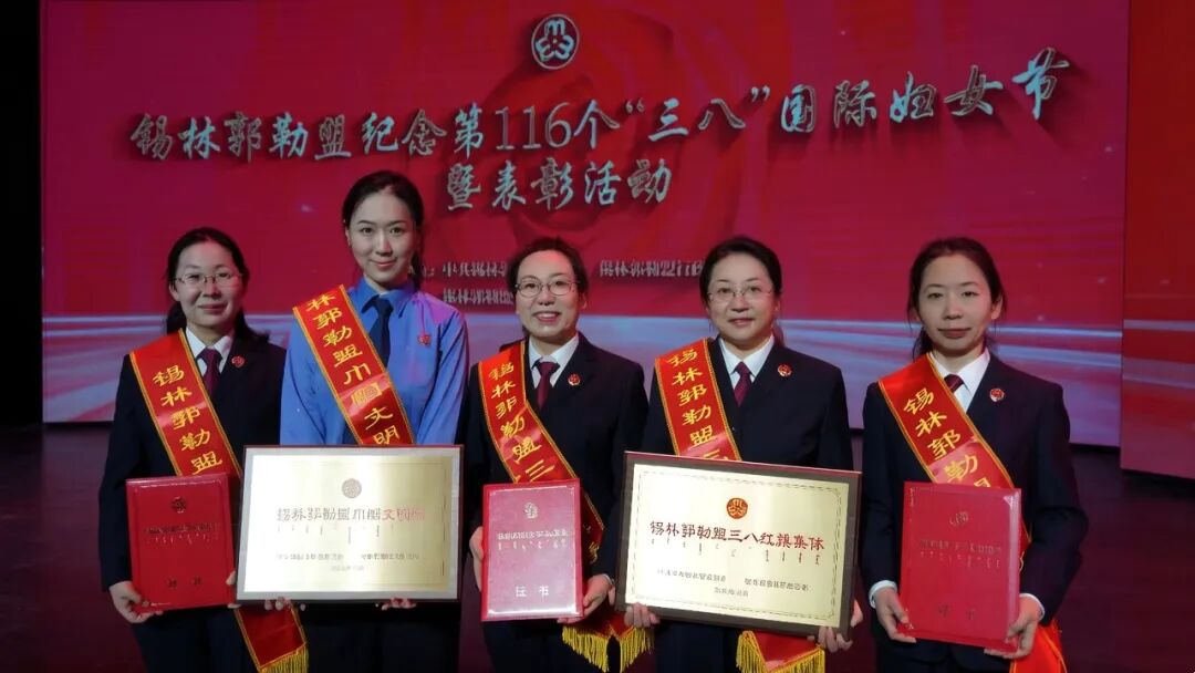 其中,锡盟检察机关荣获五项表彰:锡盟检察分院案件管理办公室主任姚晓娟;太仆寺旗人民检察院党组副书记、副检察长贾玉宏;苏尼特左旗人民检察院检委会专职委员包迎春,荣获“锡林郭勒盟三八红旗手”。正蓝旗人民检察院荣获“锡林郭勒盟三八红旗集体”。苏尼特右旗人民检察院“沐其尔”未成年人检察团队荣获“全盟巾帼文明岗”。